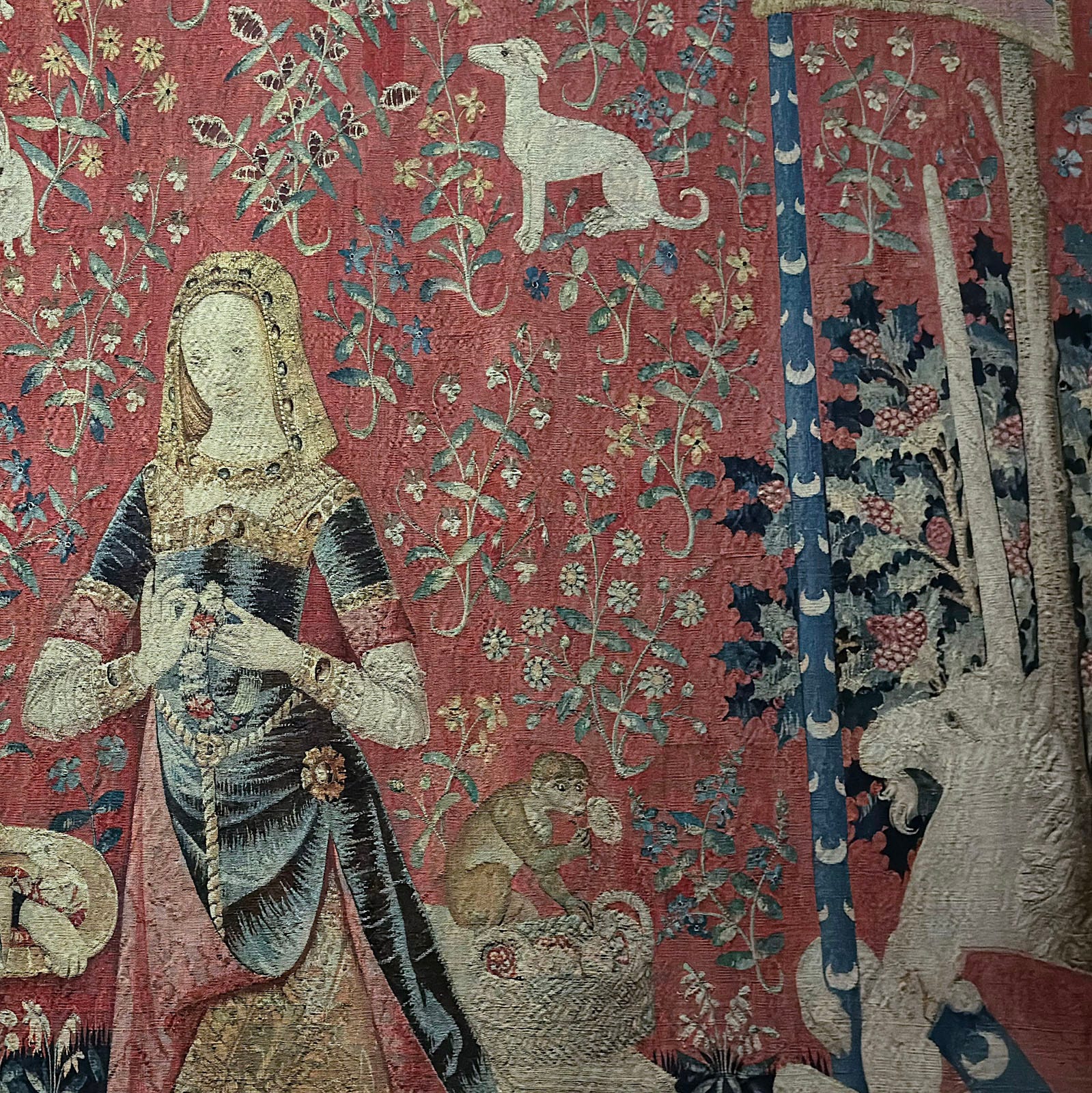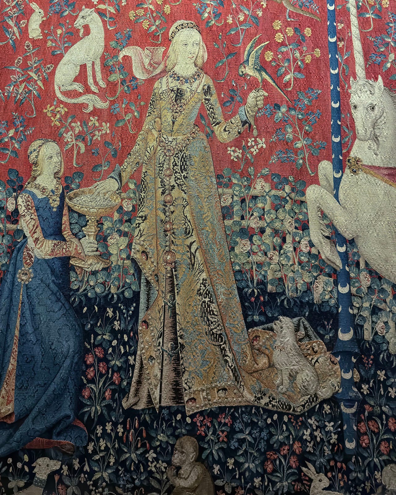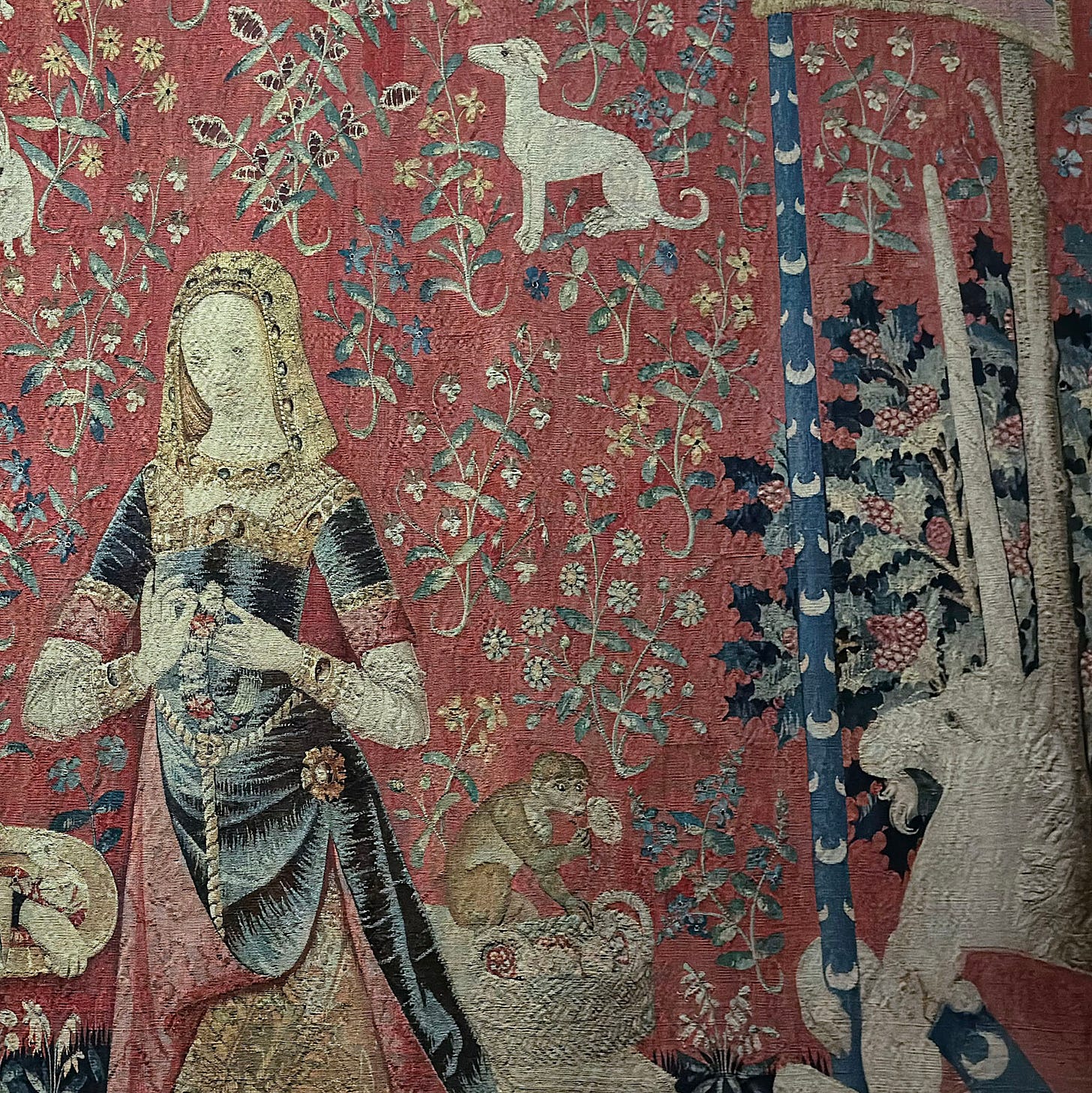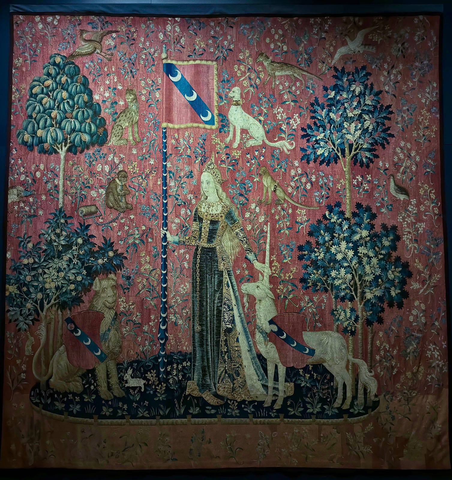 These tapestries do not show a narrative but are instead more of a meditation on earthly pleasure and courtly love. Five of the six tapestries represent the five senses — a common motif in cyclical visual art of the late Middle Ages and Renaissance (and one that you can still find even in modern art).
