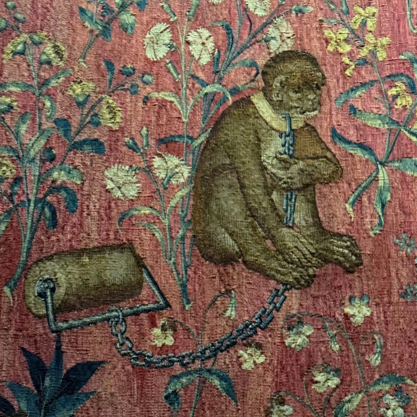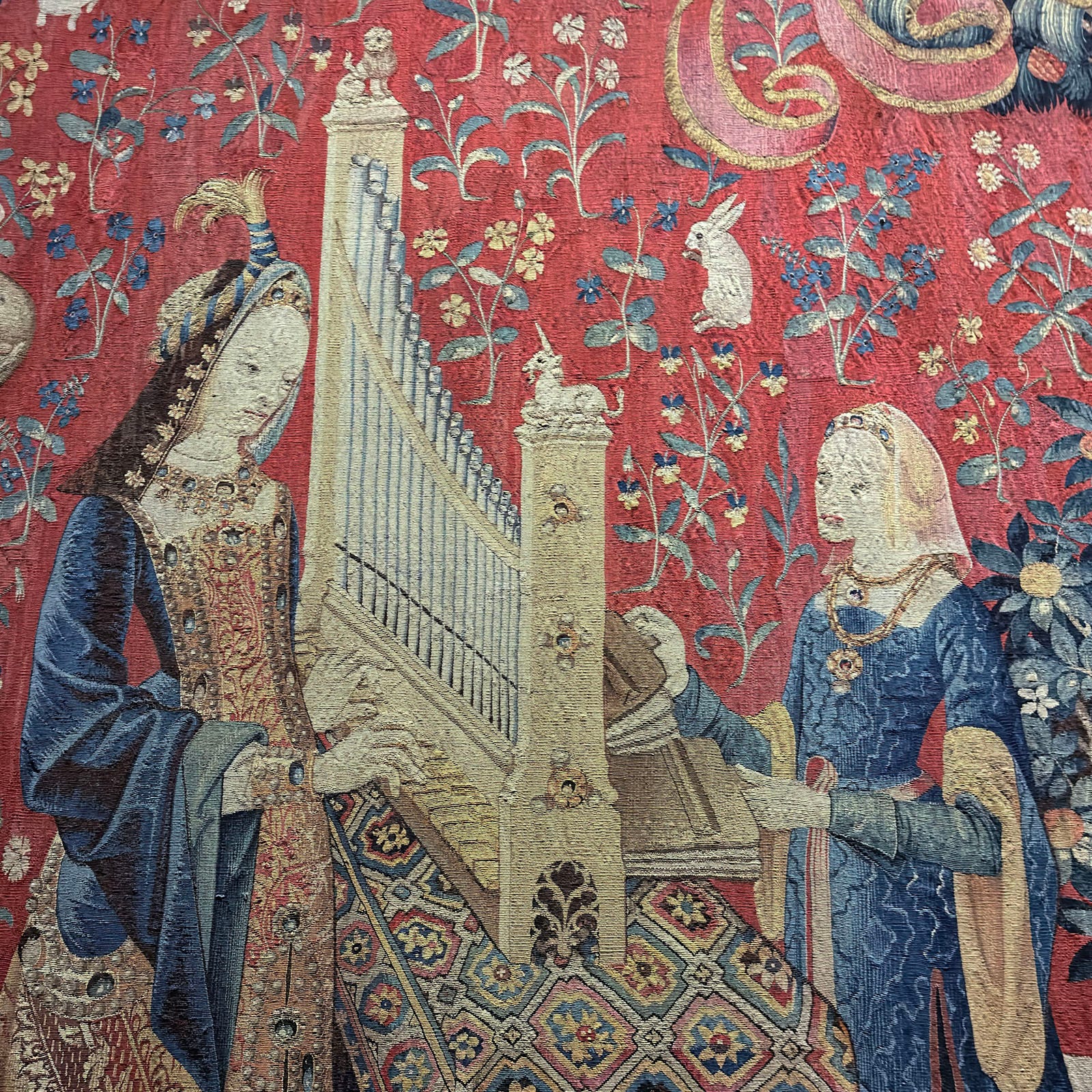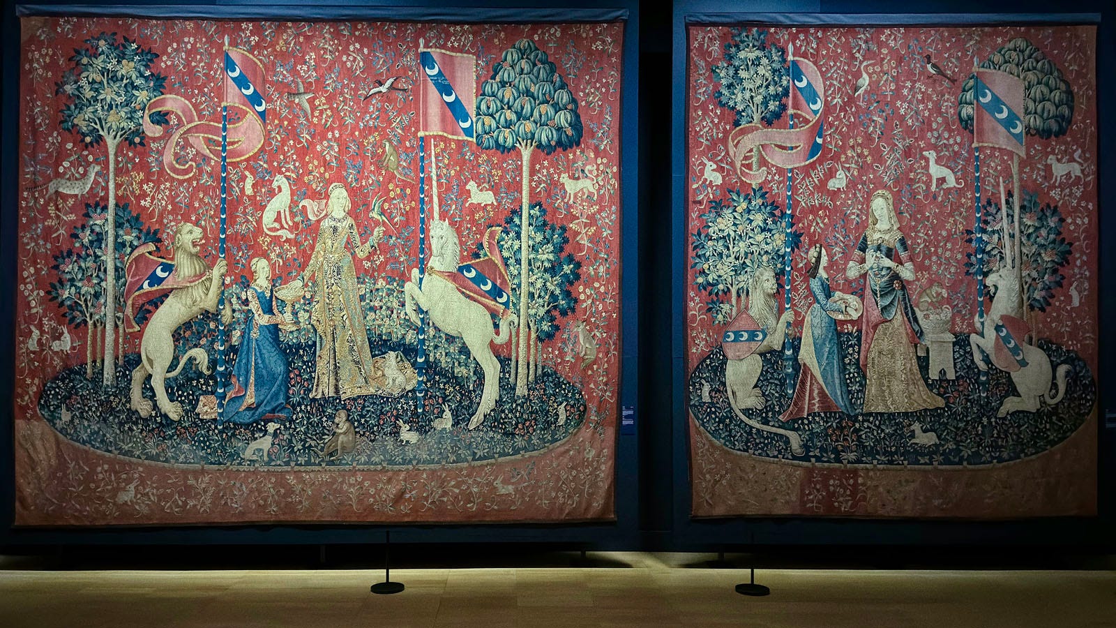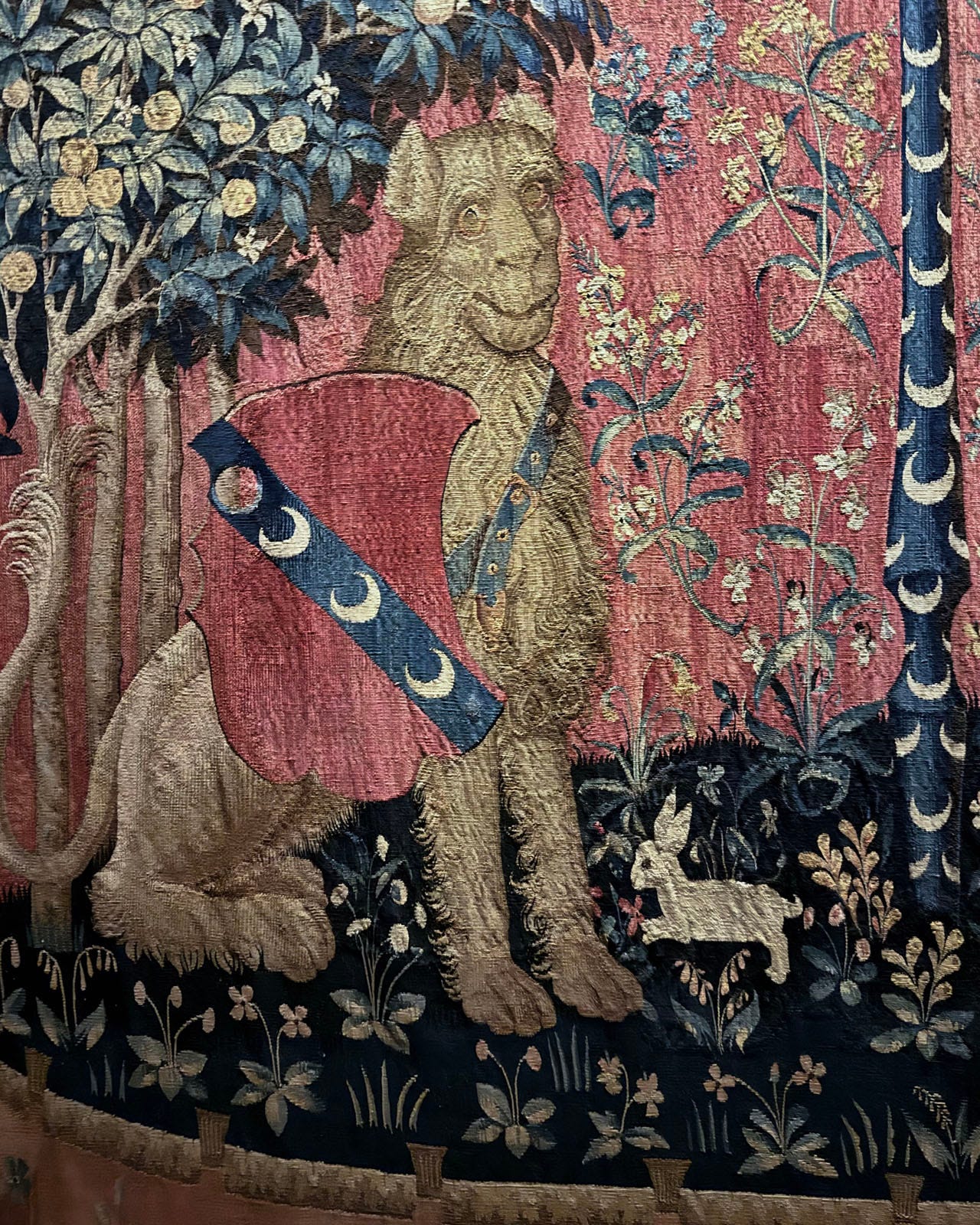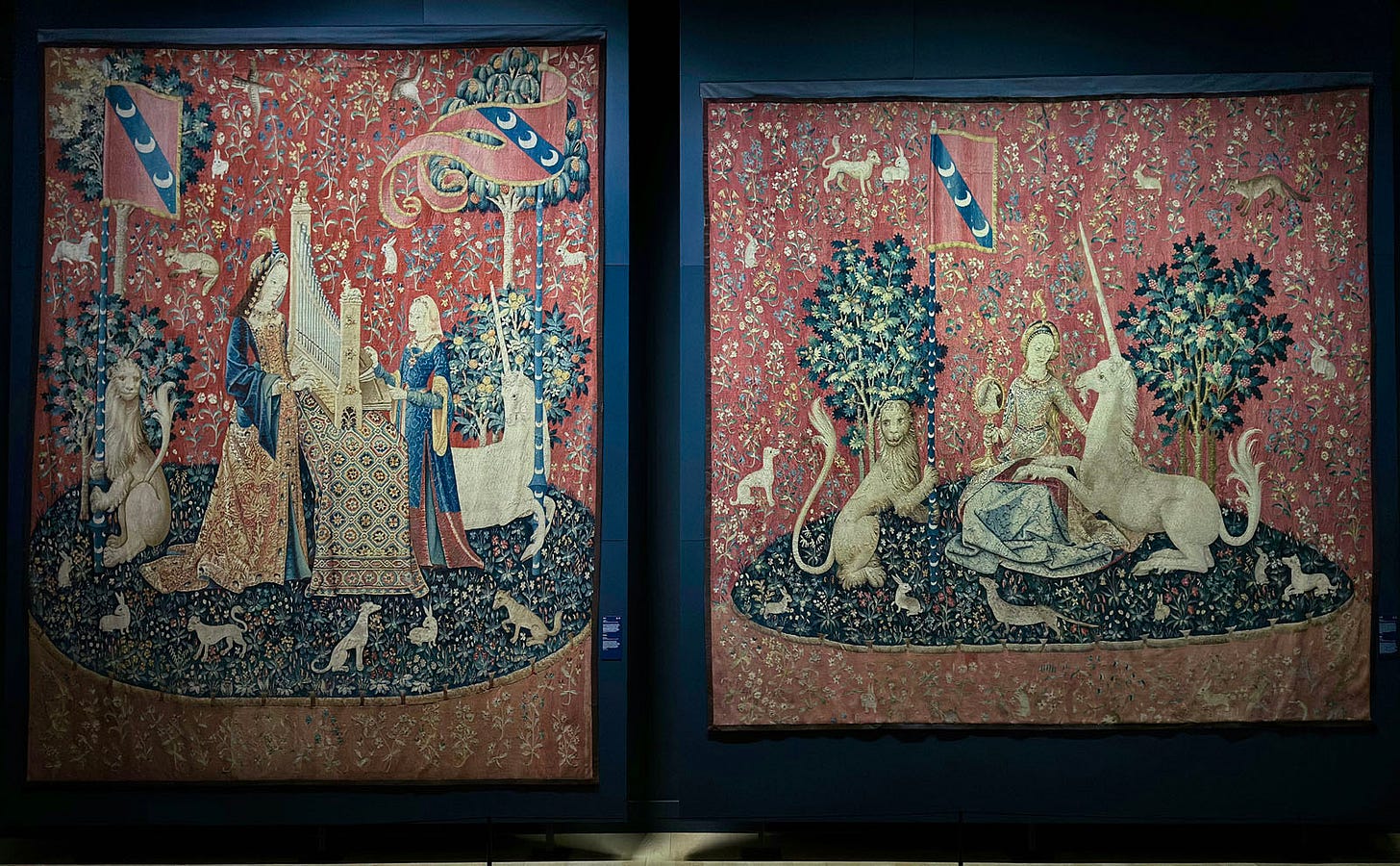 These tapestries do not show a narrative but are instead more of a meditation on earthly pleasure and courtly love. Five of the six tapestries represent the five senses — a common motif in cyclical visual art of the late Middle Ages and Renaissance (and one that you can still find even in modern art).