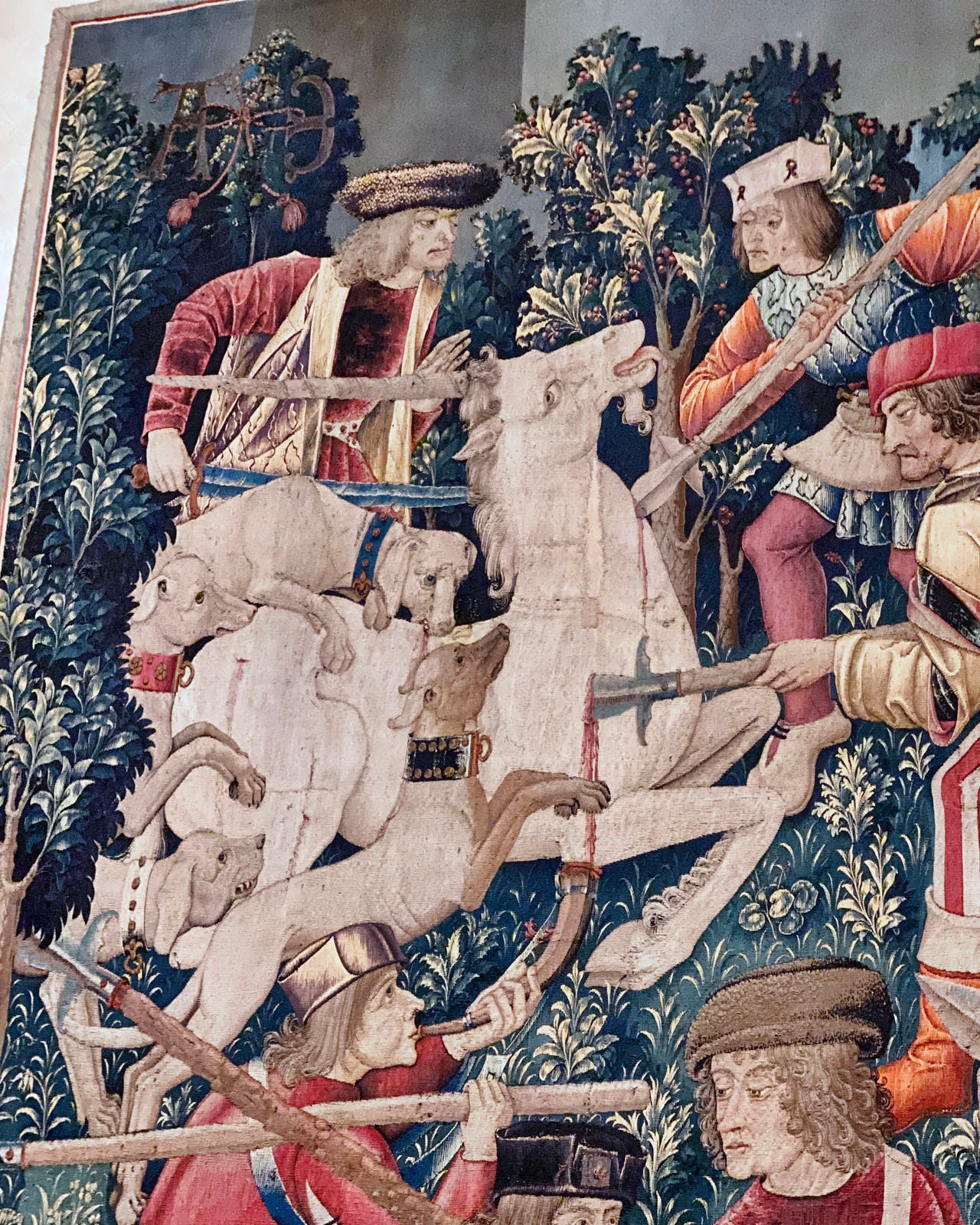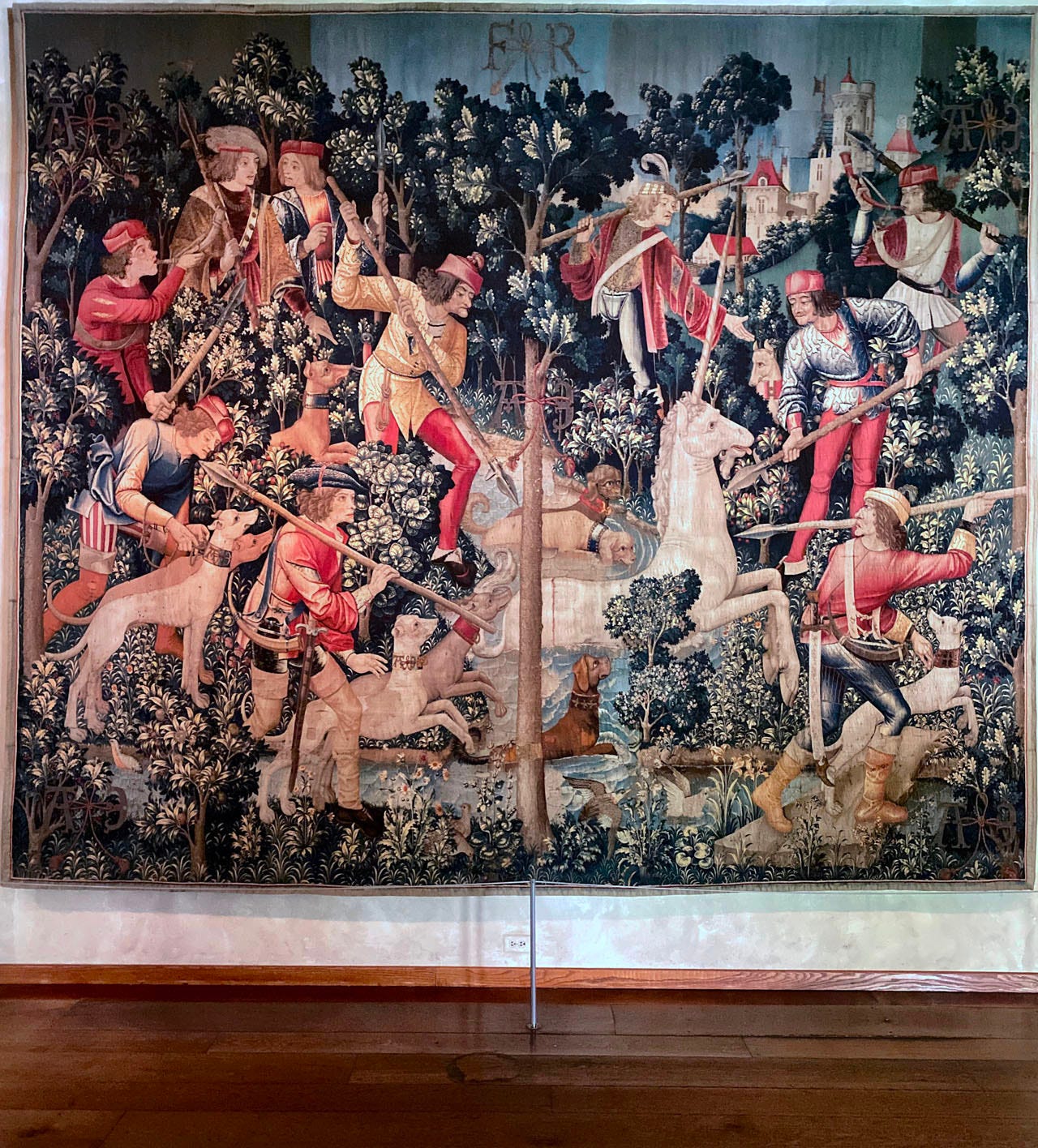 The “Hunt of the Unicorn” tapestries were made in Brussels around 1495-1505, possibly from designs made in Paris. Very little is known about why they were made and for whom, and even the “AE” monogram provides no definitive help.