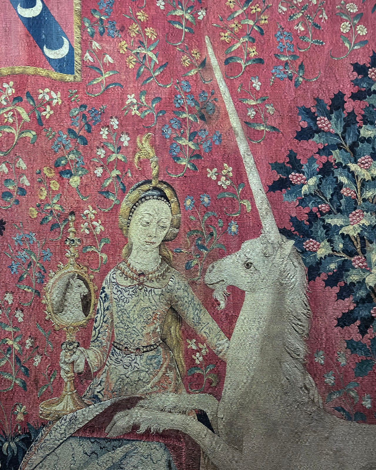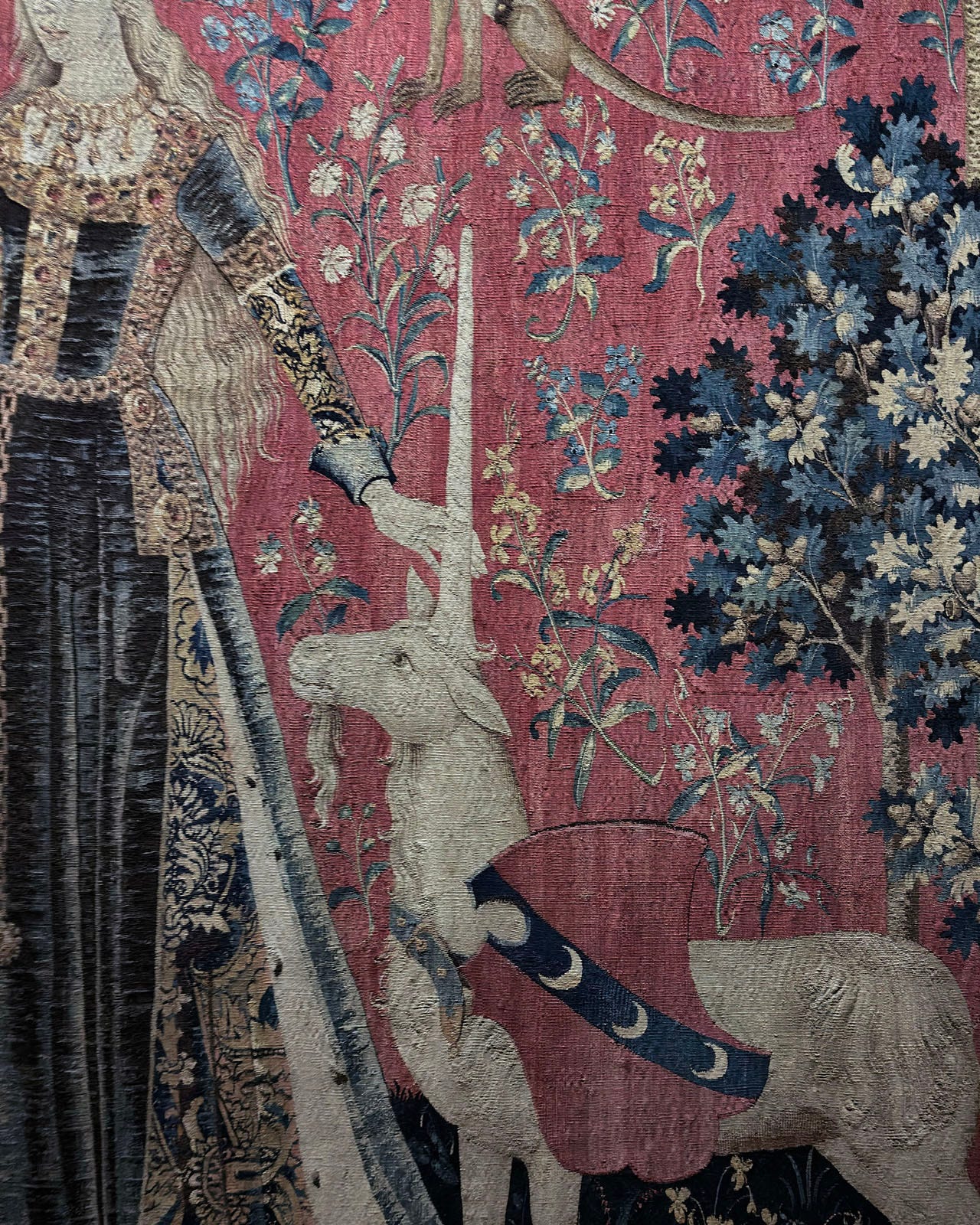 While I greatly enjoy the “Hunt of the Unicorn” tapestries and love its narrative and martial details, it’s “The Lady and the Unicorn” that I find more compelling. There’s something about the scenes floating in millefleur backgrounds, with animals sprinkled about all Eden-like and the Lady enjoying quiet moments with her unicorn and maidens. It creates a fanatical world that I wish I could magically step into.