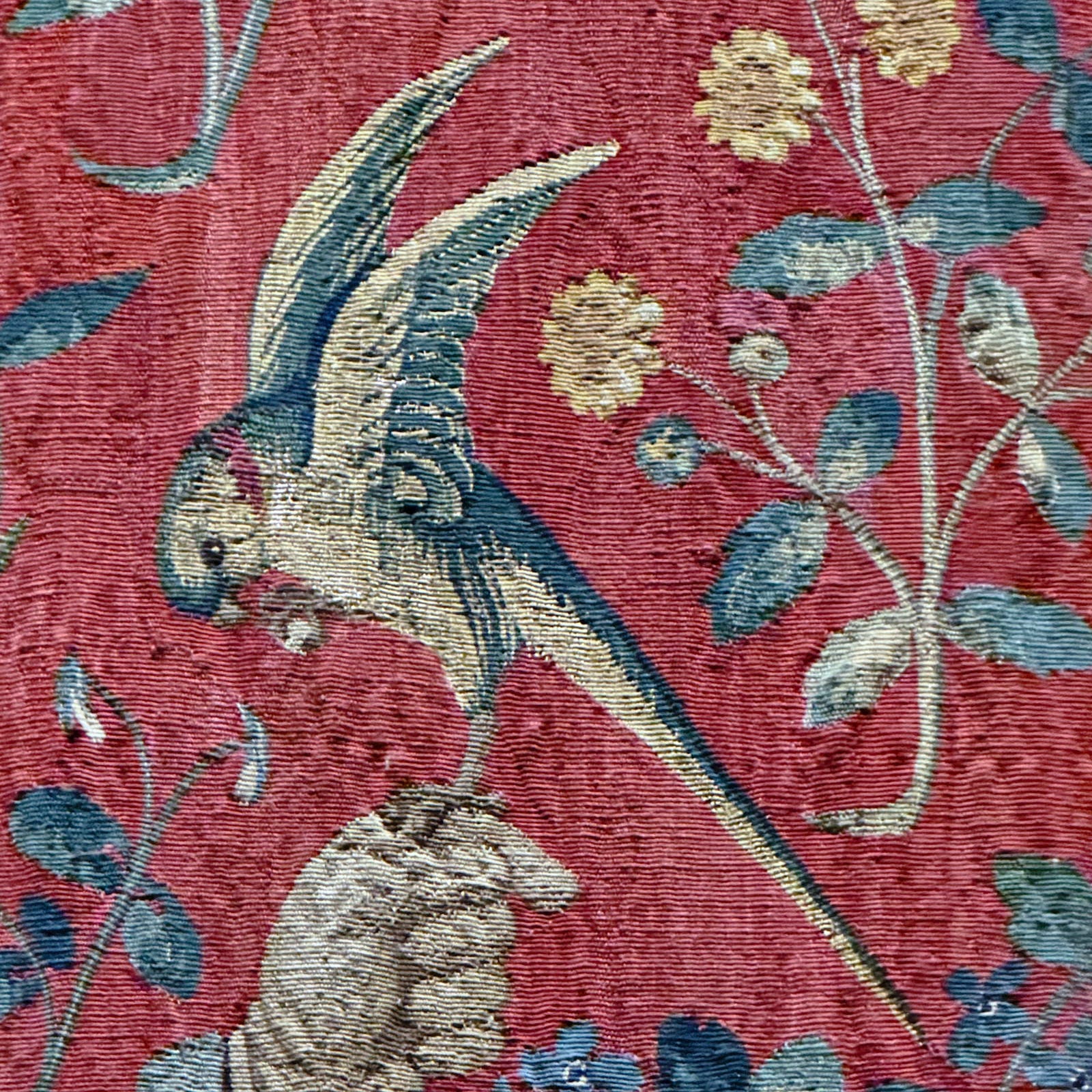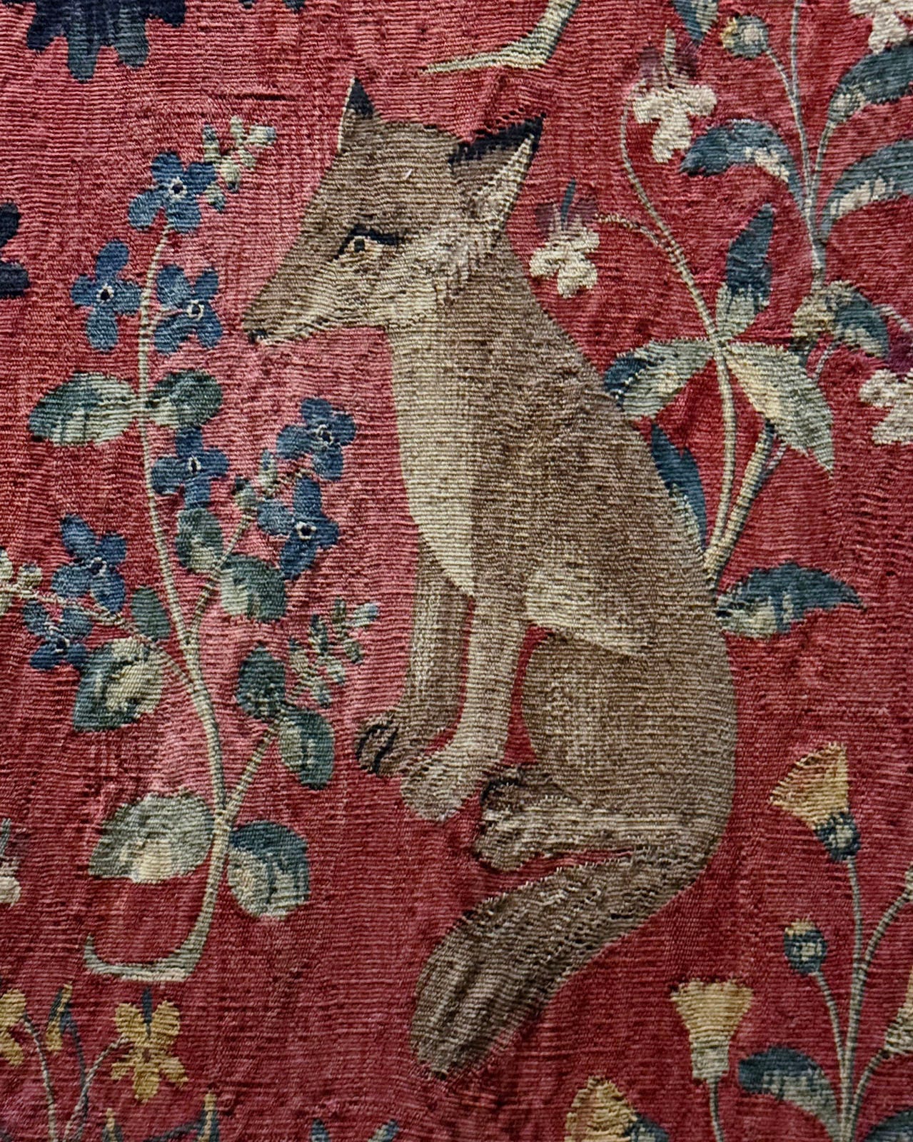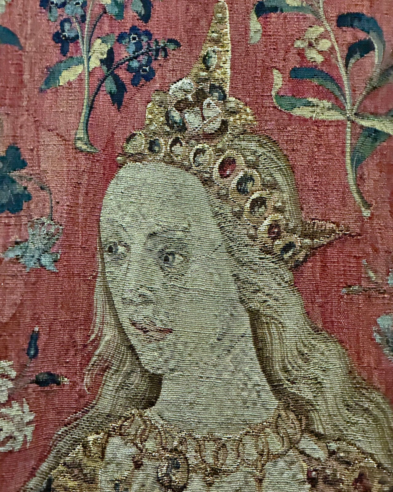 These are all my photographs, and the low lighting in the Musee de Cluny — while understandable for preservation purposes — prevented my shots from showing the colors properly. While my detail photos provide some close-up views you will not find elsewhere, the Wikipedia page on “The Lady and the Unicorn” cycle has some great high resolution photos of each tapestry with brilliant colors. You may want to check those out as well.