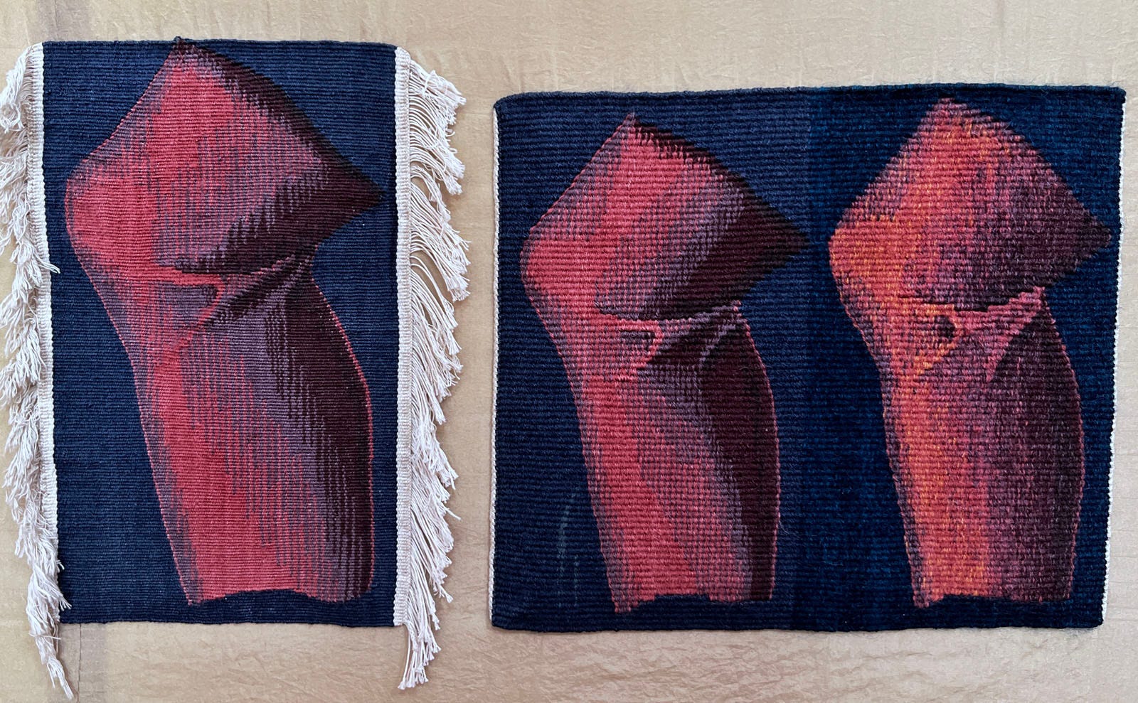 One major change they did make — though it will not come out in my photos and is not even really noticeable in person unless you get really close — is cut the thread count in half. Figure 4 shows example swatches using the original eight warps per centimeter and the reproductions’ four warps per centimeter. You can see the difference in the photo, but you would need to be very close to the tapestries themselves, comparing them side-by-side, to see the difference.