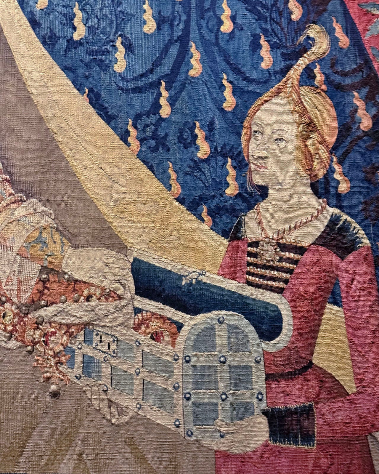However, it also seems plausible to me that this tapestry functions as a dedication, with the inscription meaning “To my sole desire” rather than “According to my sole desire.” In this reading, the entire cycle becomes an offering to a beloved, quite possibly as a wedding gift from groom to bride. The lady’s gesture of placing jewelry into a casket would then represent not renunciation but dedication — offering her treasures to her beloved.